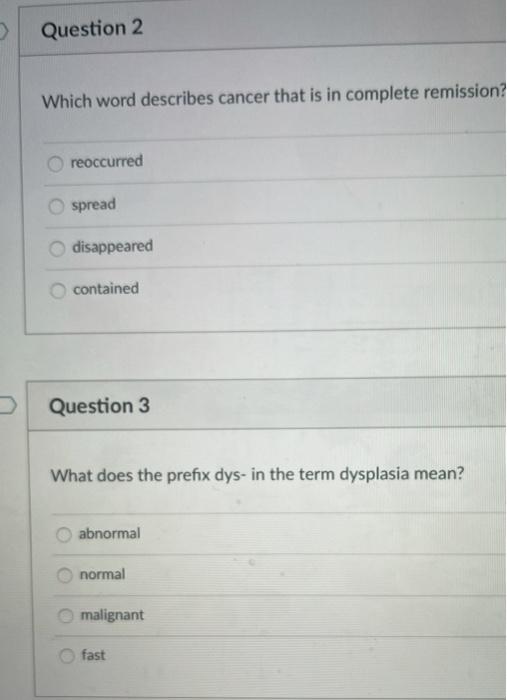 Remission means that the signs and symptoms of your cancer are reduced. Use the menu to choose a different section to read in this guide. Reoccurred spread disappeared contained Question 3 What does the prefix dys- in the term dysplasia mean.