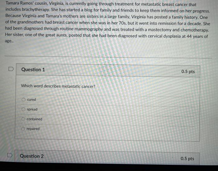 Happily the liver cyst was gone the next time I was imaged and I began the next phase of my cancer journey. Cured is an incredibly powerful word for cancer patients and their families. Cured spread contained repaired Question 2 05 pts Question 2 Which word describes cancer that is in complete remission.